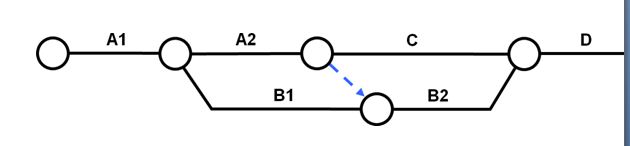 Outre l'aspect technique consistant à tracer 4 tâches au lieu de 2, il convient chaque fois de vérifier soigneusement toutes les relations d'antécédence auxquelles contribuaient les deux tâches en question avant la mise à jour. Sinon, les gains sur les délais escomptés de la mise en parallèle risquent de ne pas être au rendez-vous.